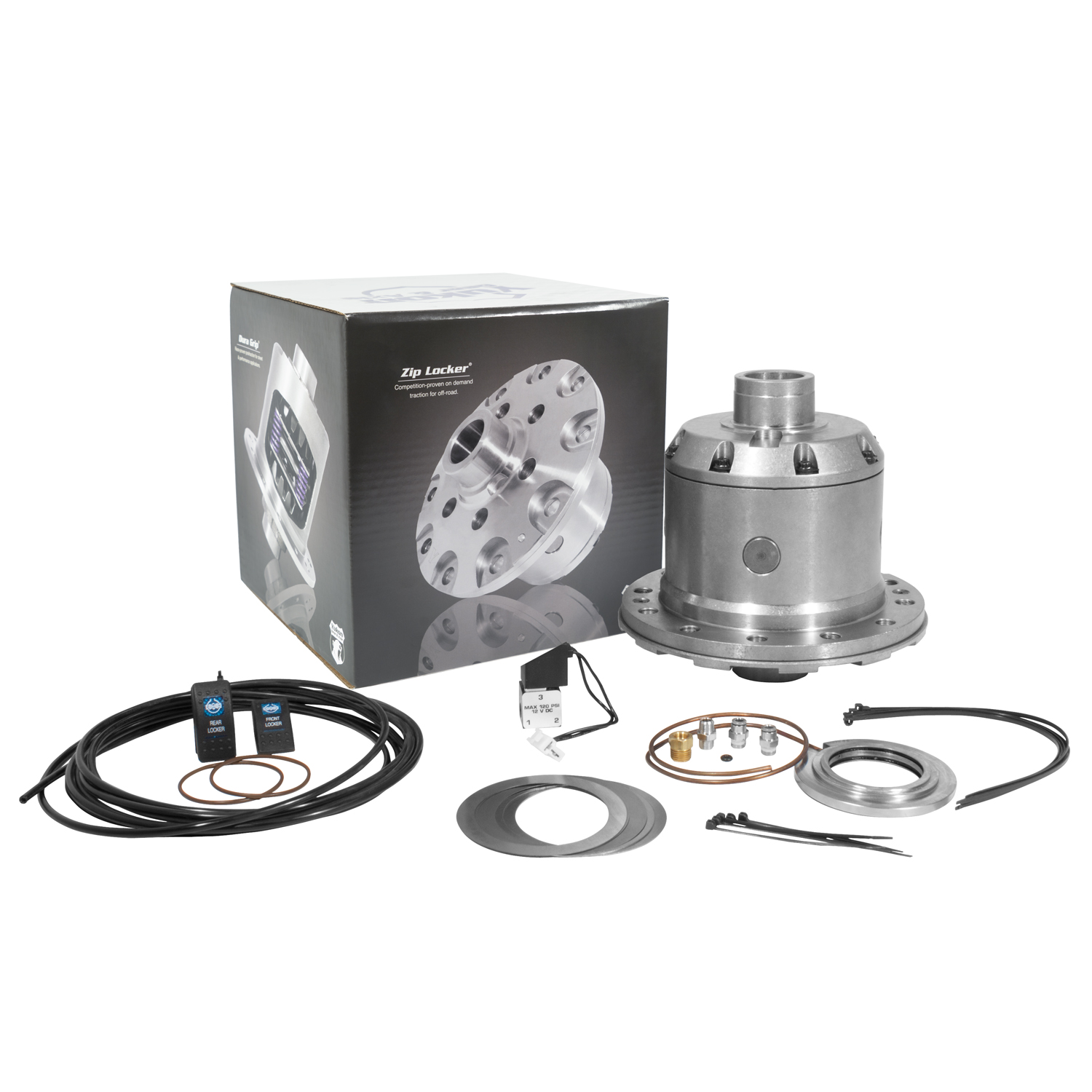 The Yukon Zip Locker is the latest in on-demand traction. Its air-operated design allows you to switch from an open differential to 100 percent lockup when you need it, giving you the ultimate in driver selectability.